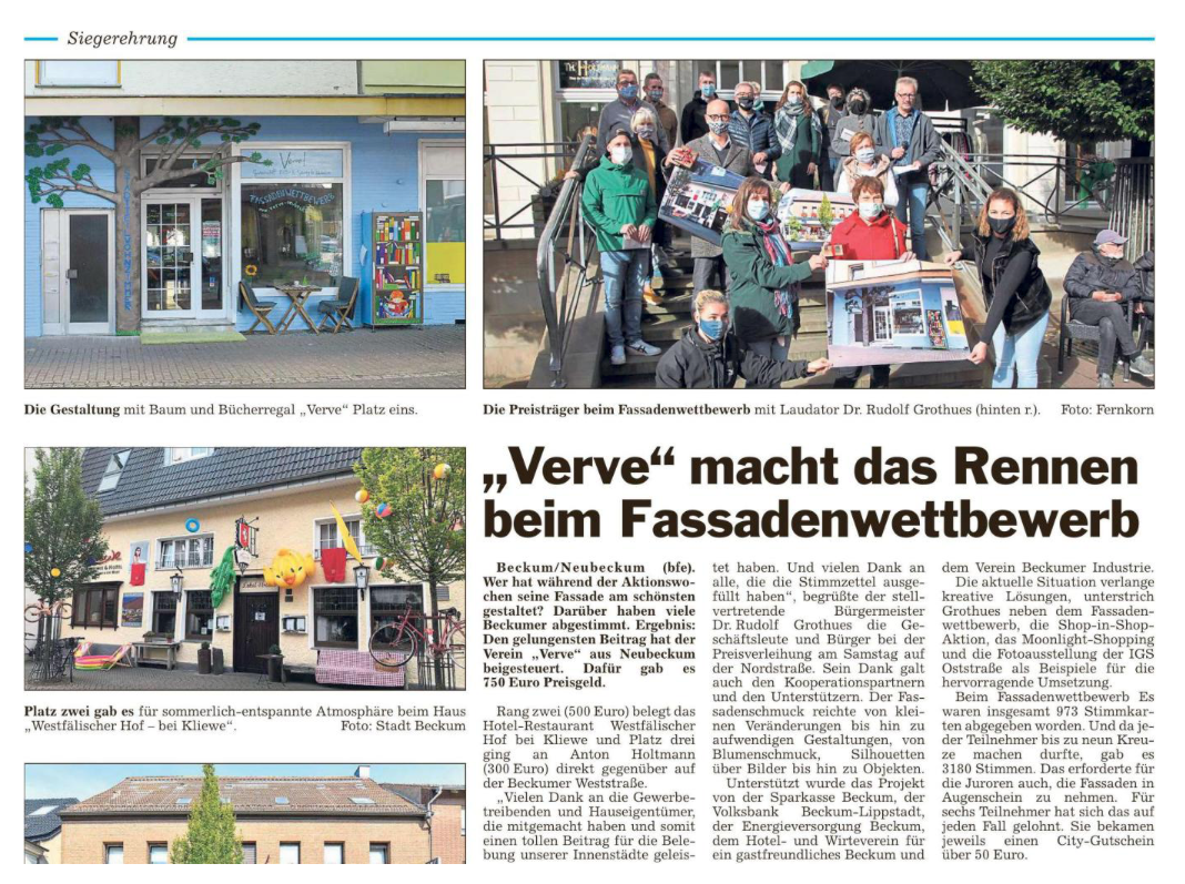Die Stadt Beckum hat zusammen mit der City.Initiative.Beckum e. V., dem Gewerbeverein Neubeckum e. V., dem Verein Beckumer Industrie e. V. und dem Hotelier- und Wirteverein für ein gastfreundliches Beckum e. V. zum Fassadenwettbewerb aufgerufen. Dabei putzten sich sowohl Objekte aus Beckum als auch aus Neubeckum während den Aktionswochen besonders heraus.